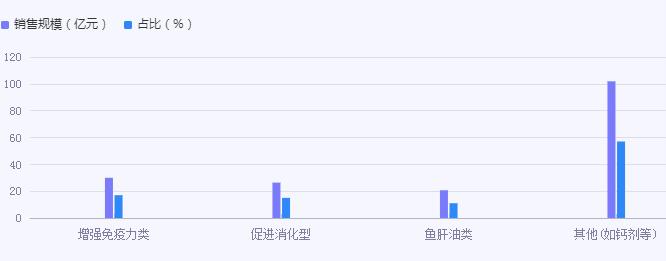 據調查,我國兒童保健食品消費以增強免疫力類為主,銷售規模約29.97億元,占比17%;促進消化型規模26.37億元,占比15%;魚肝油類20.68億元,占比11%;其他(如鈣劑等)101.88億元,占比57%。