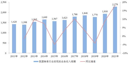 圖表:2011年至2021年我國軸承行業實現的業務收入規模與同比增速