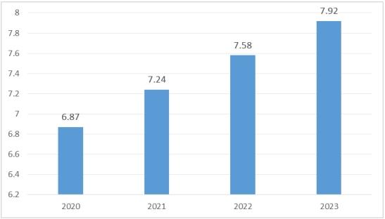 近年來,我國羽毛球行業市場規模穩步擴張,2020年受疫情影響,行業規模有所下降,隨著疫情被有效控制,行業規模開始回升,到2022年,我國羽毛球行業市場規模約為7.58億元,同比增長14.5%;產量約為6.69億只,同比增長8.6%;需求量約為3.34億只,同比增長12.1%,2023年我國羽毛球市場規模已經達到7.92億元。