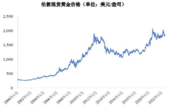 國際黃金價格與全球通貨膨脹情況、能源價格、美元匯率和國際重大政治事件等因素有關(guān)。2000年至2011年,受互聯(lián)網(wǎng)泡沫破裂、伊拉克戰(zhàn)爭爆發(fā)和金融危機(jī)等因素影響,美元持續(xù)貶值,推動黃金價格持續(xù)上漲;2012年以后,金融危機(jī)影響逐步消退,全球和美國經(jīng)濟(jì)開始復(fù)蘇,避險情緒消退,黃金價格開始下降,而后黃金價格處于震蕩期;從2019年開始,受美國經(jīng)濟(jì)走弱預(yù)期及全球化新冠肺炎疫情的影響,全球?qū)嵭辛炕瘜捤烧?,刺激了黃金的保值需求,國際金價進(jìn)入快速上漲通道。