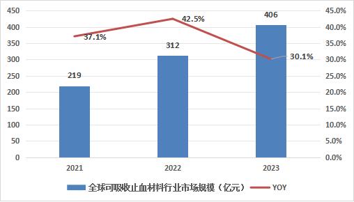 從市場情況來看,全球范圍內(nèi),可吸收止血材料市場呈現(xiàn)出穩(wěn)定的增長趨勢。根據(jù)頭豹研究院相關(guān)數(shù)據(jù)來看,2021-2023年期間,全球可吸收止血材料市場規(guī)模呈現(xiàn)出持續(xù)快速增長態(tài)勢,截至2023年底,全球可吸收止血材料市場規(guī)模增長至為406億元。三年間年復(fù)合增長率約達36%。這一增長主要得益于醫(yī)療技術(shù)的不斷進步和手術(shù)應(yīng)用的擴大,使得可吸收止血材料在各種手術(shù)和創(chuàng)傷場景中發(fā)揮越來越重要的作用。
