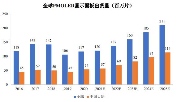 圖表:全球PMOLED顯示面板出貨量(百萬片)