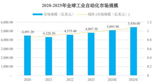 工業自動化技術的不斷成熟,生產裝置、控制裝置、反饋裝置和輔助裝置等工業自動化設備在機床、風電、紡織、包裝、塑料、建筑、采礦、交通運輸和醫療等行業的應用規模不斷擴大,工業自動化市場得到了長足的發展。數據顯示,2023 年全球工業自動化市場規模達到 4,807.3 億美元。未來隨著全球工業 4.0 時代的持續推進,各應用領域對工業自動化設備的需求將進一步增加,預計到 2025 年全球工業自動化市場規模到將達 5,436.60 億美元。