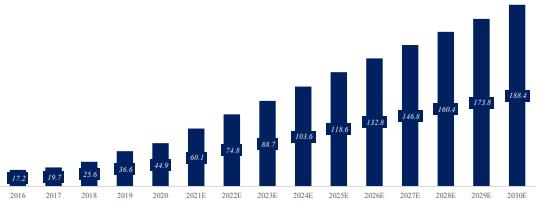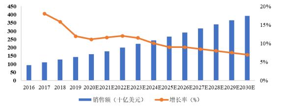 圖表:全球抗腫瘤藥物市場規模及增速(2016-2030E)