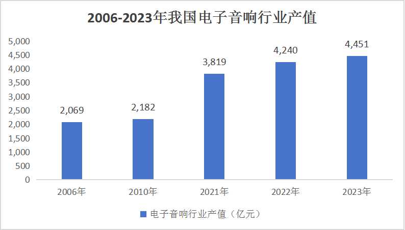 我國電子音響行業起步于 1979 年,有著深厚的歷史積累。自 1999 年開始,我國電子音響行業產值以每年超過 30%的速度增長,至 2006 年產值已達 2,069 億元,2006 年后行業整體發展進入平穩增長階段。2010年達到2,182億元。之后繼續上升,2021 年行業總產值增長至 3,819 億元,到2022年增長至4240億元,預計 2023年行業總產值將達到 4,451 億元。經過三十多年的不斷發展,我國電子音響設備行業目前處于平穩發展階段,近五年行業平均增長率為 6.82%。