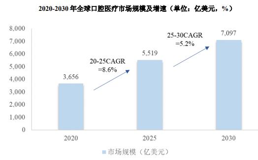 2020年全球口腔醫療市場規模達到3,656億美元。隨著老齡化進程加速,預計2020年-2025年全球口腔醫療市場將以8.6%的復合增速增長,至2025年全球市場規模將達到約5,519億美元;伴隨齒科美容需求的不斷上升、民營口腔診所的日益普及和口腔技術的進步,預計2025年-2030年全球口腔醫療市場將以5.2%的復合增速增長,至2030年全球市場規模將達到約7,097億美元。