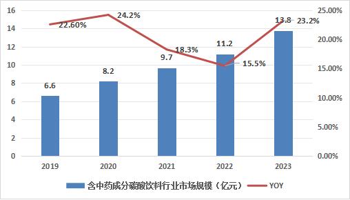 根據(jù)觀研天下相關(guān)調(diào)研數(shù)據(jù)顯示,2019-2023年期間,中國含中藥成分碳酸飲料行業(yè)市場規(guī)模總體呈現(xiàn)出持續(xù)增長態(tài)勢,截至2023年底,中國含中藥成分碳酸飲料行業(yè)市場規(guī)模增長至為13.8億元,同比2022年增長23.2%。