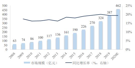 圖表:2008-2020年全球義齒銷售規模及增速(單位:億元,%)