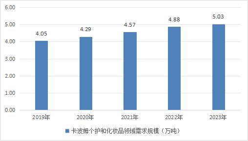圖表:2019-2023年卡波姆個護和化妝品領域需求規模(萬噸)