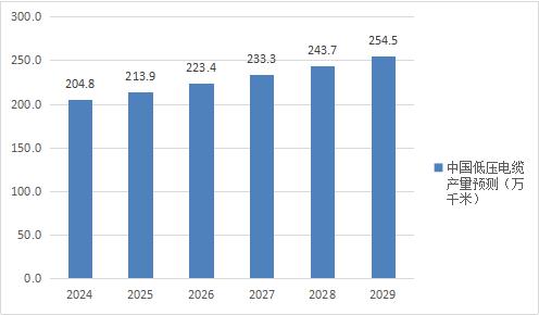 圖表:2024-2029年中國低壓電纜行業產量規模預測(單位:萬千米)