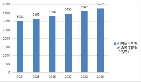 圖表:2024-2029年中國低壓電纜市場規模預測(單位:億元)