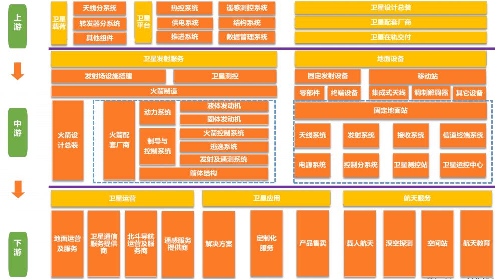 商業航天產業鏈較為復雜,涉及環節眾多,主要包括衛星制造、衛星發射及應用及運營服務等環節。衛星制造產業鏈有效載荷種類多、客戶需求差異大、技術壁壘比較高;發射服務提供方提供商業發射運載服務,在整個衛星發射的全部流程中扮演著至關重要的角色。