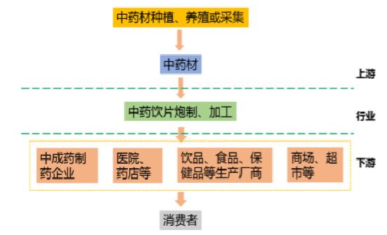 中藥飲片產業鏈的上游為中藥材種植、養殖或采集和初加工等環節;下游包括中成藥和中藥配方顆粒制造業、中醫醫療機構、藥店等。中藥飲片以中醫臨床處方藥,或制成中成藥、中藥配方顆粒、保健品、食品等形式被消費者使用。