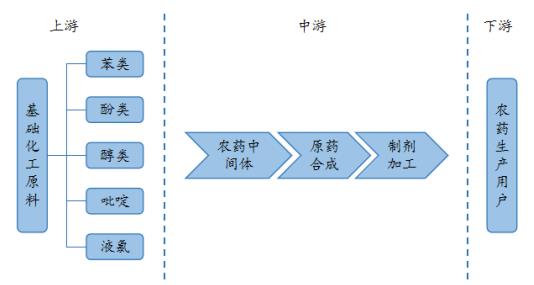 農(nóng)藥行業(yè)屬于精細(xì)化工產(chǎn)業(yè),化學(xué)農(nóng)藥行業(yè)與行業(yè)上下游關(guān)系示意圖如下: