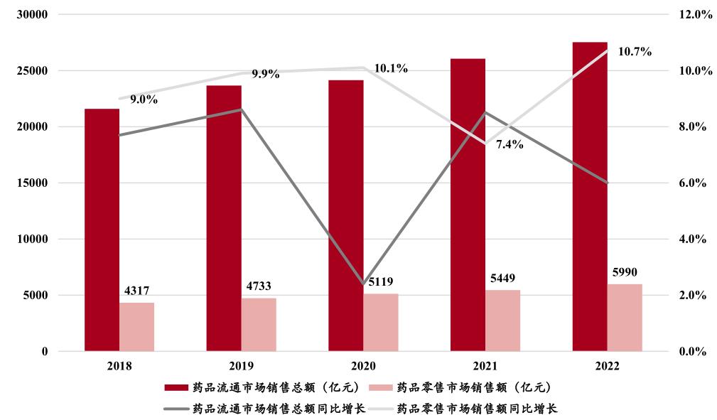 近年來醫藥商業行業規模依舊保持穩健增長。根據商務部數據,全國藥品流通市場銷售總額由2018年的21586億元增至2022年的27516億元,2018年-2022年年均復合增長率為6.3%。其中,藥品零售市場銷售額由2018年的4317億元增至2022年的5990億元,2018年-2022年年均復合增長率為8.5%。