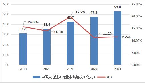 根據中研普華產業研究院調研數據顯示,2019-2023年期間,中國光電選礦設備行業市場規模年復合增長了達11%,截至2023年底,中國光電選礦設備行業市場規模增長至為53億元,同比2022年期間增長了11.5%。