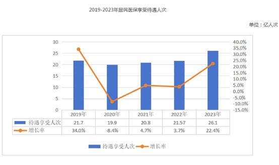 截至2023年底,城鄉居民基本醫療保險參保96294萬人。2023年,參加居民醫保人員享受待遇26.1億人次,比上年增長21.1%。其中,普通門急診20.8億人次,門診慢特病3.4億人次,住院2億人次。