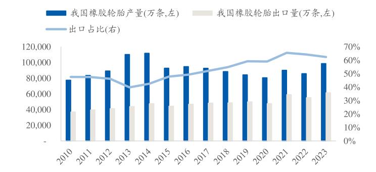 我國輪胎市場年產量約10億條,占全球比重過半。我國輪胎市場方面,根據國家統計局信息,2023年全國共生產輪胎9.9億條,同比+15.3%,較2014年高位11.2億條仍有一定距離。產量市占方面,按照2022年全球17.5億條數量計算,我國占比達56%。