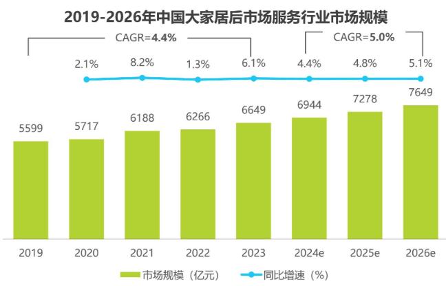 2023年中國(guó)大家居后市場(chǎng)服務(wù)行業(yè)市場(chǎng)規(guī)模達(dá)6649億元,同比增長(zhǎng)6.1%,伴隨房地產(chǎn)市場(chǎng)的邊際改善帶動(dòng)大家居產(chǎn)品銷(xiāo)售,大家居行業(yè)產(chǎn)品創(chuàng)新及以舊換新政策推動(dòng)消費(fèi)者更新?lián)Q代,預(yù)計(jì)2024-2026年均復(fù)合增長(zhǎng)率為5.0%,2026年市場(chǎng)規(guī)模將達(dá)7649億元。