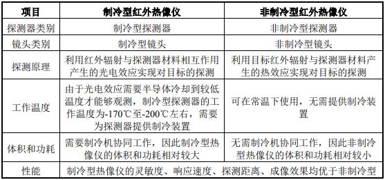 制冷型紅外產品具有靈敏度高、響應速度快、探測距離遠等優勢,但由于價格相對昂貴,主要被用于周界安全、海岸監視、機載、艦載、彈載、星載應用等對性能要求較高的高端軍用領域。非制冷型紅外產品的性能相對弱于制冷型紅外產品,但其具有體積小、功耗低且價格較低的特點,因此主要用于輕武器瞄具、單兵裝備等對性價比和便攜性要求較高的領域。