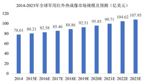 2014-2023年全球軍用紅外熱成像市場規模及預測(億美元)