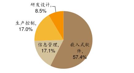 我國工業軟件市場規模增速較快,研發設計類軟件占比偏低。根據中研普華產業研究院,全球工業軟件市場規模從2019年的4107億美元增至2023年的5027億美元,CAGR達5.18%,預測2024年規模將至5288億美元;對于我國而言,2020-2023年工業軟件市場規模的CAGR達13.20%,預測2024年規模將至3197億元。2022年,我國工業軟件中的嵌入式軟件市場份額最大,占比達57.4%,經營管理類工業軟件和生產控制類工業軟件市場占比分別為17.1%、17.0%,研發設計類軟件占比較小,僅為8.5%。而從全球2016年數據來看,經營管理和研發設計類占比分別為51%、24%。