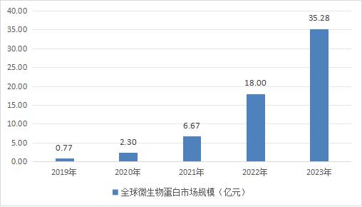 圖表:2019-2023年全球微生物蛋白市場規模(億元)