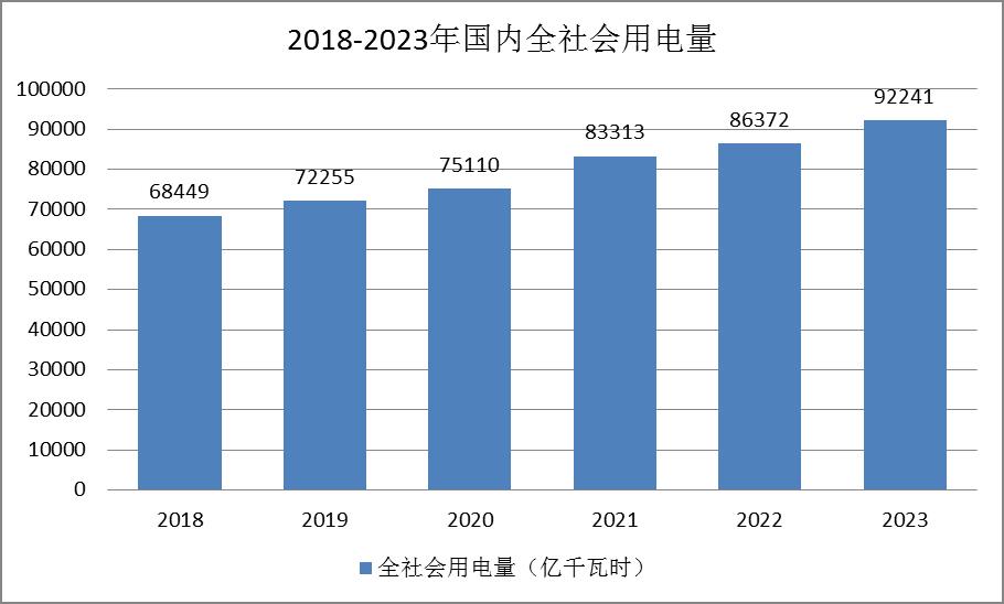 國家能源局數據顯示,2023年全社會用電量92241億千瓦時,同比增長6.7%,其中規模以上工業發電量為89091億千瓦時。從分產業用電看,第一產業用電量1278億千瓦時,同比增長11.5%;第二產業用電量60745億千瓦時,同比增長6.5%;第三產業用電量16694億千瓦時,同比增長12.2%;城鄉居民生活用電量13524億千瓦時,同比增長0.9%。