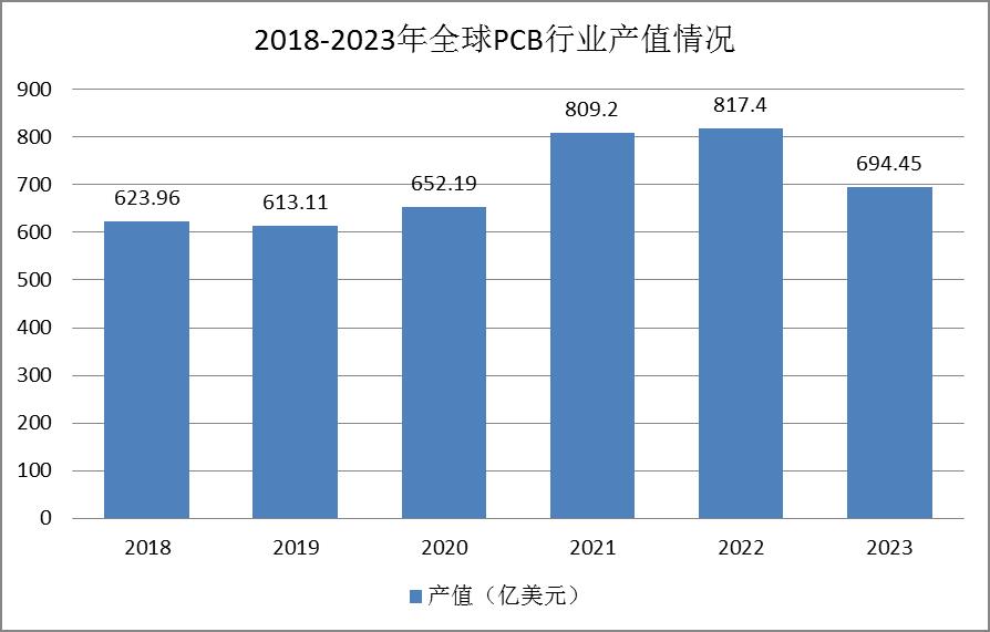 圖表:2018-2023年全球PCB行業產值情況