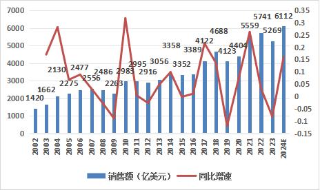 根據iFind最新發布的數據顯示,受制于全球手機、PC、平板設備出貨量的下降,2023年全球半導體行業銷售額較2022年有所下降,總計5269億美元,降幅為8.2%,但仍為歷史第三高數據。自2023年下半年開始,半導體行業市況逐步轉暖,其中第四季度銷售額為1460億美元,同比2022年同期增長11.6%,環比2023年第三季度增長8.4%。預計在算力芯片的需求增長以及存儲行業復蘇的雙重推動下,2024年全球半導體行業規模將增長16%,達6112億美元。