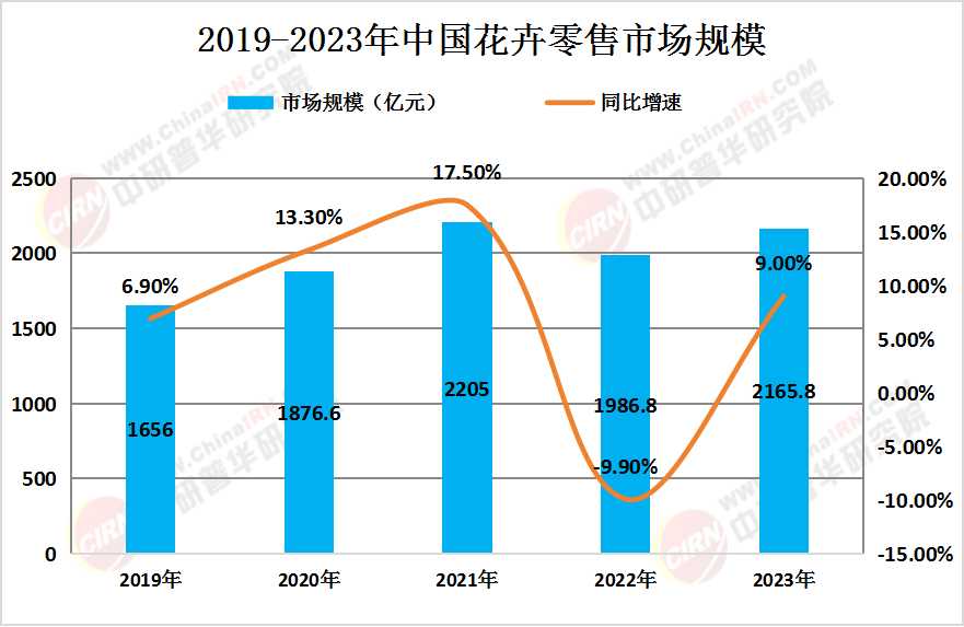 近年來,隨著人們生活水平的提高和消費觀念的轉變,鮮花市場需求持續增長。2023年全國花卉零售市場總規模達2165.8億元,同比增長9.0%。這一數據表明,花卉市場保持了強勁的增長勢頭,成為消費市場中的一股重要力量。