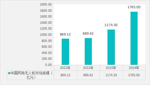 2023年中國民用無人機市場規模為1174.3億元,同比增長32%。?2024年中國民用無人機市場規模預計將達到1765億元人民幣。??