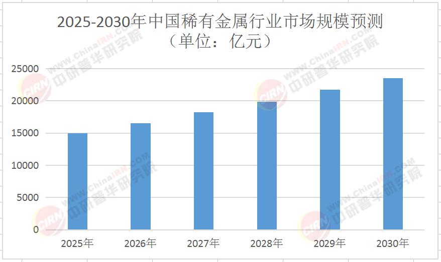 根據(jù)中研普華產(chǎn)業(yè)研究院最新發(fā)布的《2025-2030年中國(guó)稀有金屬行業(yè)市場(chǎng)全景調(diào)研與投資前景預(yù)測(cè)報(bào)告》顯示,2025年中國(guó)稀有金屬行業(yè)市場(chǎng)規(guī)模預(yù)計(jì)達(dá)1.5萬(wàn)億元,至2030年將突破2萬(wàn)億元,年均復(fù)合增長(zhǎng)率(CAGR)達(dá)8.5%。這一增長(zhǎng)主要受新能源、高端裝備制造及戰(zhàn)略性新興產(chǎn)業(yè)需求驅(qū)動(dòng)。